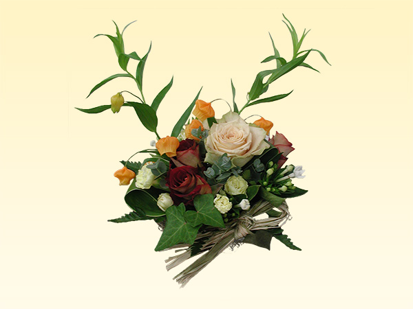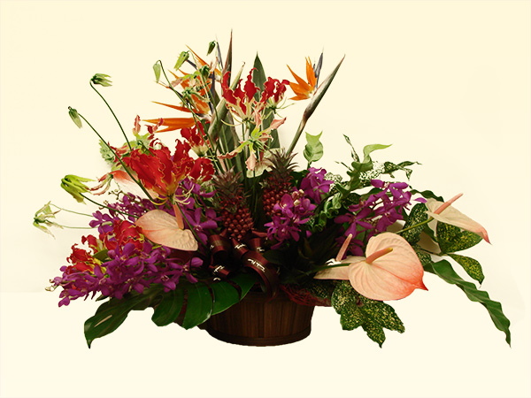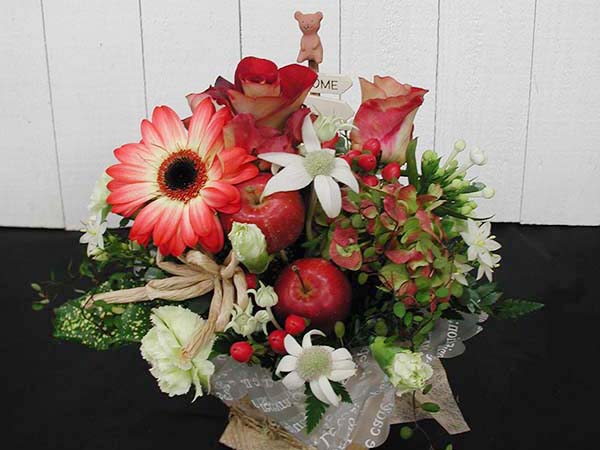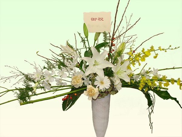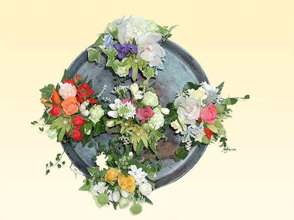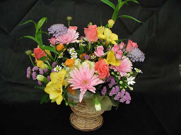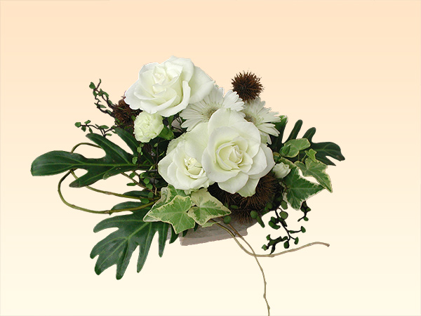 バスケットや陶器などに吸水性スポンジを使って花を挿しデザインします。